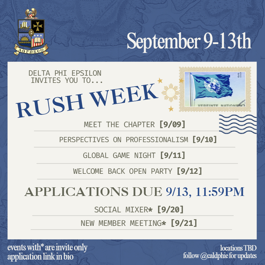 Delta Phi Epsilon is a Professional Foreign Service Fraternity founded on January 25, 1920, in Washington, D.C., to promote good fellowship among people studying or engaged in foreign service.